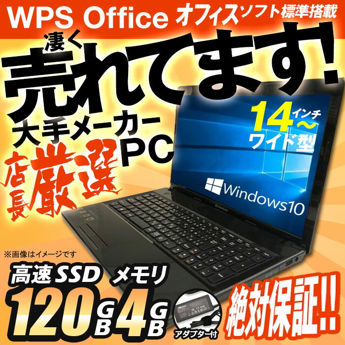 スペック 商品内容ノートパソコン 中古 ( 中古パソコン ) モデル 店長厳選お任せ OS Windows10 64bit CPU Intel Celeron or Core2 メモリ 4GB ストレージ HDD250GB ディスプレイ 14インチワイド 以上〜 オプティカルドライブ DVDドライブ 無線LAN なし(無線LANオプション有の場合※USB外付け式※「入荷時期により一部内蔵もあります」) 付属ソフト KING SOFT Office(WPS Office 2019) 付属品 互換または純正ACアダプター 保証 1ヶ月動作保証 備考 ゴム足・PCカード・SDスロットダミー等の欠品は保証対象外となります。